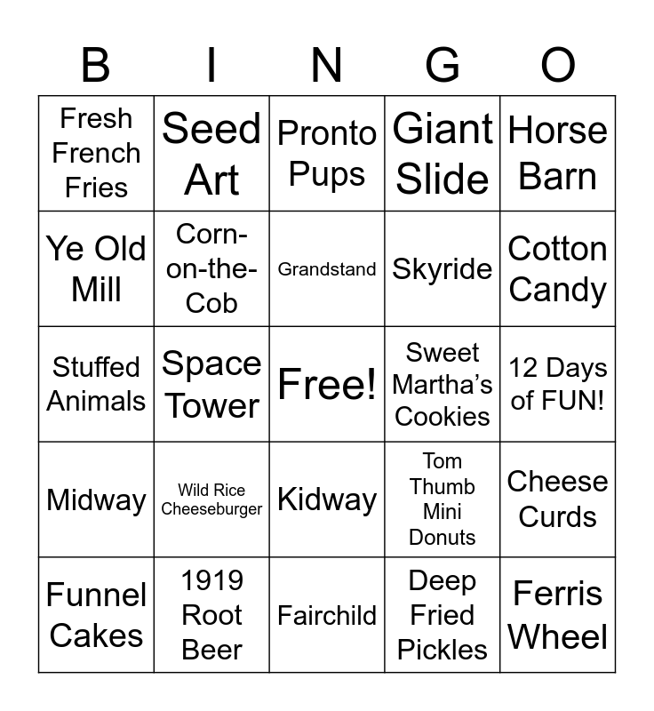 This bingo card has a free space and 31 words: Fairchild, Turkey Legs, Space Tower, Deep Fried Candy Bars, Fresh French Fries, Pronto Pups, Corn-on-the-Cob, Tom Thumb Mini Donuts, Sweet Martha’s Cookies, Deep Fried Pickles, 12 Days of FUN!, Ferris Wheel, Foot Long Hot Dogs, Butterfly House, Cotton Candy, Gizmo, Cheese Curds, Wild Rice Cheeseburger, Midway, Kidway, Horse Barn, Butter Sculptures, Funnel Cakes, Seed Art, Skyride, Ye Old Mill, Giant Slide, Stuffed Animals, 1919 Root Beer, Grandstand and Est. 1854.