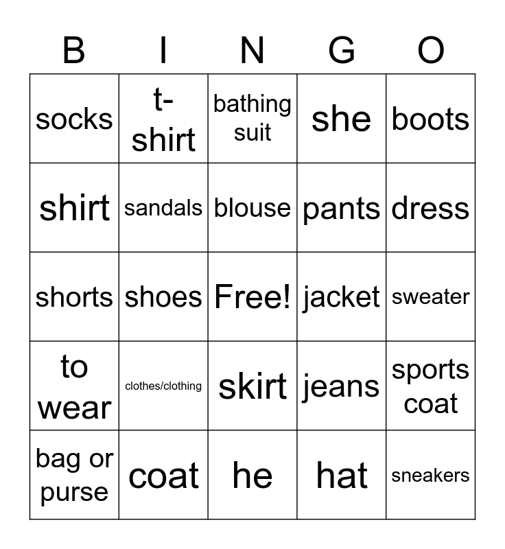 This bingo card has a free space and 24 words: clothes/clothing, coat, blouse, bag or purse, boots, socks, shirt, t-shirt, jacket, skirt, pants, shorts, jeans, sports coat, sandals, hat, sweater, bathing suit, dress, shoes, sneakers, to wear, she and he.