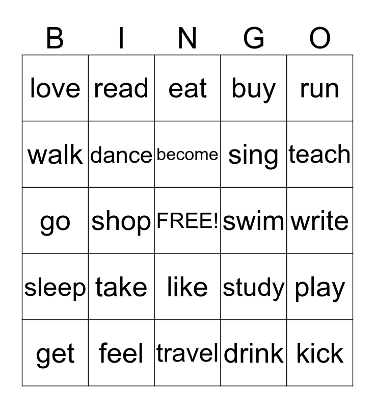 This bingo card has a free space and 24 words: take, feel, become, get, run, love, walk, read, swim, like, sing, go, study, play, dance, drink, write, eat, teach, shop, kick, sleep, buy and travel.