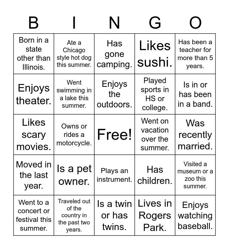 This bingo card has a free space and 24 words: Is a pet owner., Traveled out of the country in the past two years., Enjoys the outdoors., Went to a concert or festival this summer., Has been a teacher for more than 5 years., Born in a state other than Illinois., Enjoys theater., Ate a Chicago style hot dog this summer., Went on vacation over the summer., Plays an instrument., Played sports in HS or college., Likes scary movies., Has children., Visited a museum or a zoo this summer., Went swimming in a lake this summer., Lives in Rogers Park., Was recently married., Has gone camping., Is in or has been in a band., Owns or rides a motorcycle., Enjoys watching baseball., Moved in the last year., Likes sushi. and Is a twin or has twins..