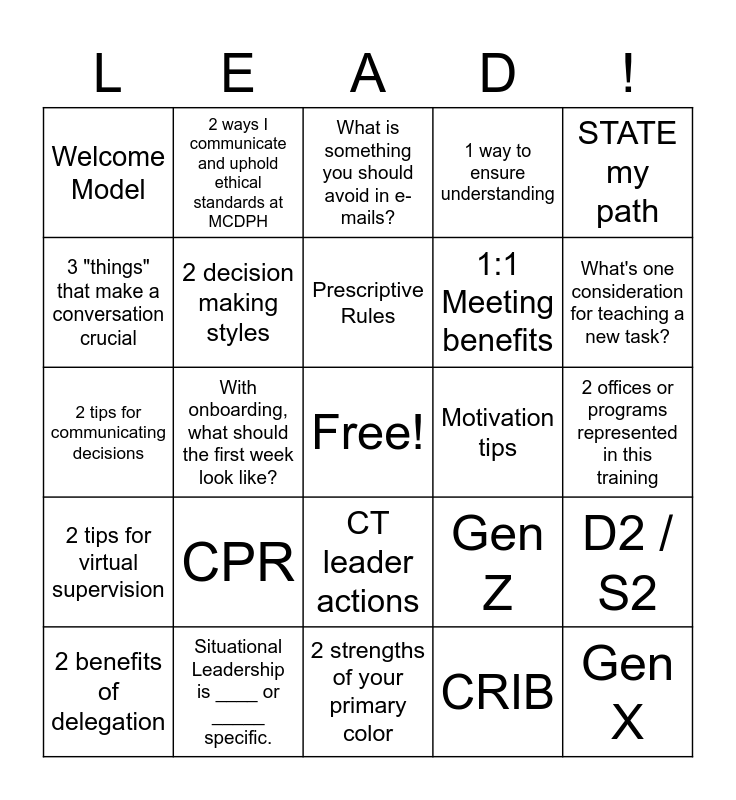 This bingo card has a free space and 25 words: CPR, 2 strengths of your primary color, Prescriptive Rules, 2 benefits of delegation, STATE my path, Welcome Model, 3 "things" that make a conversation crucial, 2 ways I communicate and uphold ethical standards at MCDPH, Motivation tips, CT leader actions, 1:1 Meeting benefits, 2 tips for communicating decisions, Gen Z, D2 / S2, 2 decision making styles, Difference between supervisor and individual contributor, 2 offices or programs represented in this training, What is something you should avoid in e-mails?, What's one consideration for teaching a new task?, With onboarding, what should the first week look like?, Gen X, Situational Leadership is ____ or _____ specific., 2 tips for virtual supervision, 1 way to ensure understanding and CRIB.