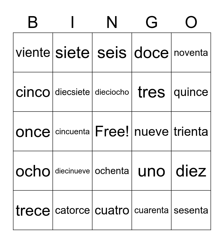 This bingo card has a free space and 27 words: uno, dos, tres, cuatro, cinco, seis, siete, ocho, nueve, diez, once, doce, trece, catorce, quince, dieciseis, diecsiete, dieciocho, diecinueve, viente, trienta, cuarenta, cincuenta, sesenta, ochenta, noventa and cien.