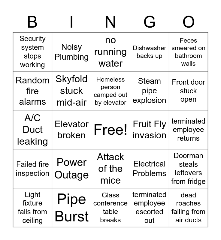 This bingo card has a free space and 24 words: Power Outage, Pipe Burst, Homeless person camped out by elevator, Light fixture falls from ceiling, Feces smeared on bathroom walls, Security system stops working, Random fire alarms, Noisy Plumbing, Fruit Fly invasion, Attack of the mice, Steam pipe explosion, A/C Duct leaking, Electrical Problems, Doorman steals leftovers from fridge, Skyfold stuck mid-air, terminated employee escorted out, terminated employee returns, no running water, Front door stuck open, Elevator broken, dead roaches falling from air ducts, Failed fire inspection, Dishwasher backs up and Glass conference table breaks.