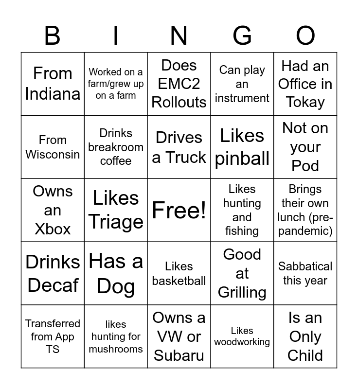 This bingo card has a free space and 25 words: Has a Dog, Owns a VW or Subaru, Drives a Truck, Transferred from App TS, Had an Office in Tokay, From Indiana, From Wisconsin, Worked on a farm/grew up on a farm, Likes hunting and fishing, Likes basketball, Likes pinball, Owns an Xbox, Good at Grilling, Sabbatical this year, Drinks breakroom coffee, Has a degree in Math, Brings their own lunch (pre-pandemic), Does EMC2 Rollouts, Not on your Pod, Likes Triage, Is an Only Child, likes hunting for mushrooms, Drinks Decaf, Can play an instrument and Likes woodworking.