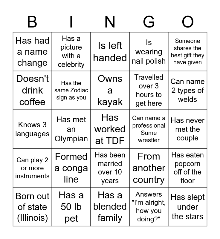 This bingo card has a free space and 24 words: Formed a conga line, Has a 50 lb pet, Owns a kayak, Born out of state (Illinois), Someone shares the best gift they have given, Has had a name change, Doesn't drink coffee, Has a picture with a celebrity, Can name a professional Sume wrestler, Has been married over 10 years, Travelled over 3 hours to get here, Knows 3 languages, From another country, Has eaten popcorn off of the floor, Has the same Zodiac sign as you, Answers "I'm alright, how you doing?", Has never met the couple, Is left handed, Can name 2 types of welds, Has met an Olympian, Has slept under the stars, Can play 2 or more instruments, Is wearing nail polish and Has a blended family.