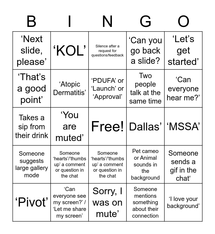 This bingo card has a free space and 24 words: Someone ‘hearts’/’thumbs up’ a comment or question in the chat, ‘Can everyone see my screen?’ / ‘Let me share my screen’, ‘PDUFA’ or ‘Launch’ or ‘Approval’, ‘Pivot’, ‘Let’s get started’, ‘Next slide, please’, ‘That’s a good point’, ‘KOL’, Dallas’, Someone ‘hearts’/’thumbs up’ a comment or question in the chat, Two people talk at the same time, Takes a sip from their drink, Pet cameo or Animal sounds in the background, Someone sends a gif in the chat‘, ‘Atopic Dermatitis’, Someone mentions something about their connection, ‘MSSA’, Silence after a request for questions/feedback, ‘Can everyone hear me?’, ‘You are muted’, ‘I love your background’, Someone suggests large gallery mode, ‘Can you go back a slide? and Sorry, I was on mute’.
