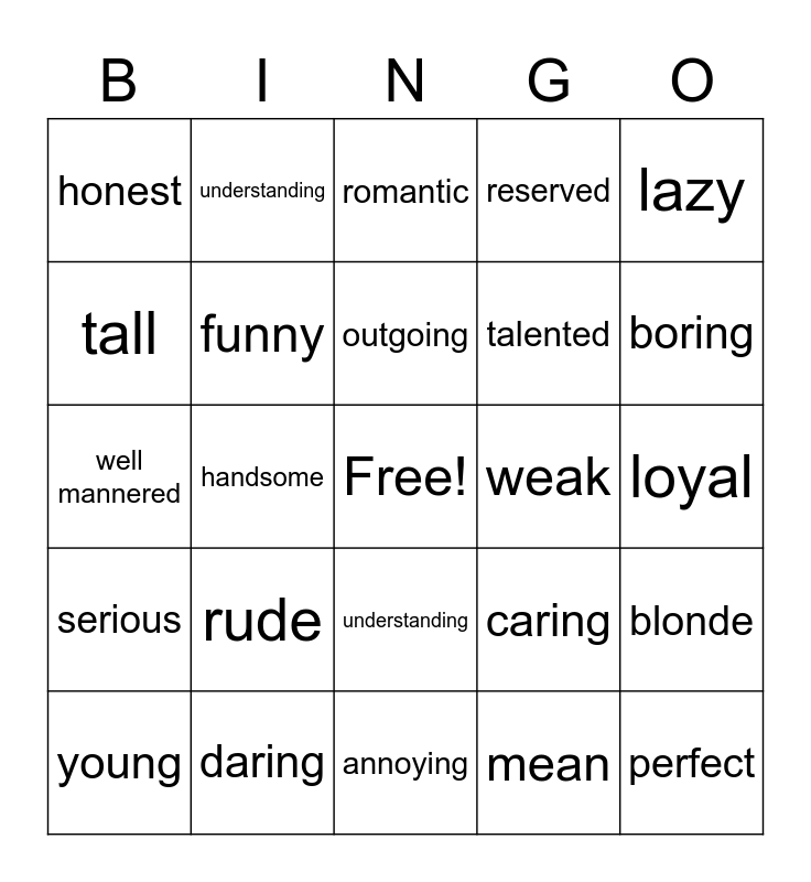 This bingo card has a free space and 34 words: nice, mean, organized, disorganized, serious, funny, lazy, young, understanding, shy, outgoing, romantic, silly, strong, weak, boring, daring, well mannered, rude, caring, understanding, athletic, honest, loyal, annoying, perfect, reserved, loud, talented, tall, short, handsome, blonde and weak.