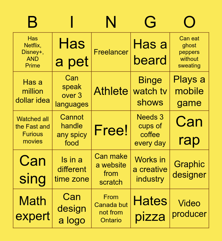 This bingo card has a free space and 52 words: Has +5k followers, Video producer, International student, From Canada but not from Ontario, Is in a different time zone, Has more than 3 siblings, Has a pet, Created a business, Has a million dollar idea, Travelled to 9 different countries, Can speak over 3 languages, Is a collector, Graphic designer, Works in a creative industry, Works in a STEM industry, Artist, Athlete, Needs 3 cups of coffee every day, Can only drink tea, Can eat ghost peppers without sweating, Cannot handle any spicy food, Hates pizza, Has Netflix, Disney+, AND Prime, Binge watch tv shows, Not a fan of Lord of the Rings, Harry Potter fan, Star Wars fan, Anime fan, Plays a mobile game, Has an allergy, Has curly hair, Has a beard, Recent grad, Cannot drive, Hotdogs over burgers, Freelancer, Can design a logo, Can make a social media campaign, Can make an ad, Can create an app, Can code, Can rap, Can sing, Writer, Can make a website from scratch, Can name all the Disney Princesses, Can name 5 Pixar movies, Watched all the Fast and Furious movies, Has a checklist, Excel expert, Math expert and Likes to share their spotify playlist.