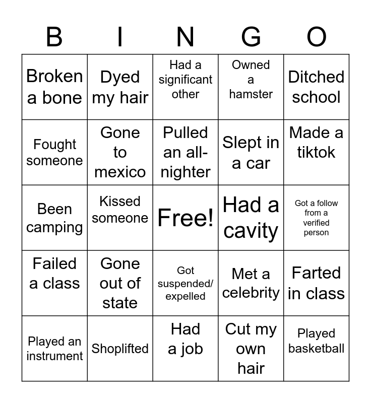 This bingo card has a free space and 24 words: Gone out of state, Shoplifted, Pulled an all-nighter, Played an instrument, Ditched school, Broken a bone, Fought someone, Dyed my hair, Had a cavity, Got suspended/ expelled, Slept in a car, Been camping, Met a celebrity, Farted in class, Gone to mexico, Cut my own hair, Got a follow from a verified person, Had a significant other, Made a tiktok, Kissed someone, Played basketball, Failed a class, Owned a hamster and Had a job.