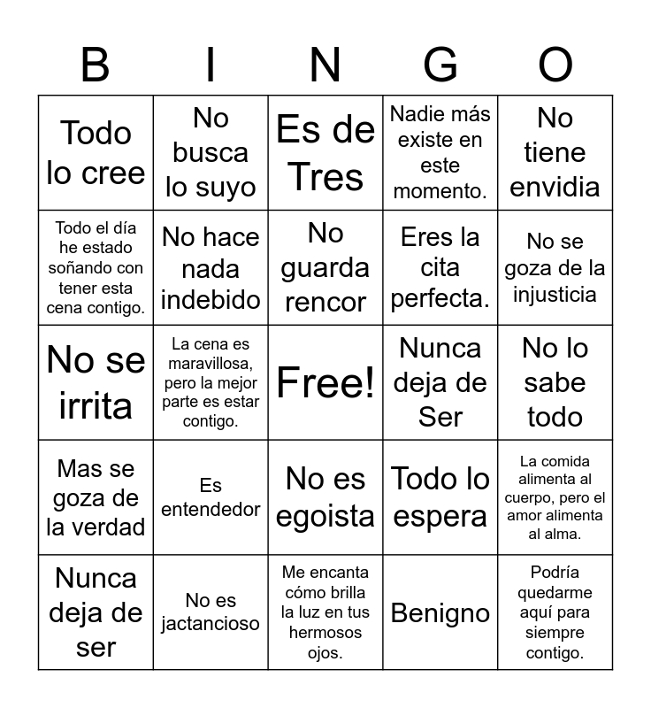 This bingo card has a free space and 34 words: Sufrido, Benigno, No se envanece, Todo lo sufre, Mas se goza de la verdad, No hace nada indebido, No tiene envidia, Nunca deja de ser, No busca lo suyo, Es Paciente, No guarda rencor, Es de Tres, Todo lo soporta, Es pacifico, Nunca deja de Ser, No se goza de la injusticia, No es jactancioso, No se irrita, Es entendedor, Todo lo espera, No es egoista, Es de Una Sola Carne, Todo lo cree, No lo sabe todo, Me encanta cómo brilla la luz en tus hermosos ojos., Podría quedarme aquí para siempre contigo., Nadie más existe en este momento., La comida es deliciosa, pero la compañía es aún mejor., Eres la cita perfecta., Todo el día he estado soñando con tener esta cena contigo., No necesito ningún postre, te tengo a ti., La cena es maravillosa, pero la mejor parte es estar contigo., La comida alimenta al cuerpo, pero el amor alimenta al alma. and Eres como un buen vino... mis ojos podrían tomarte toda la noche..