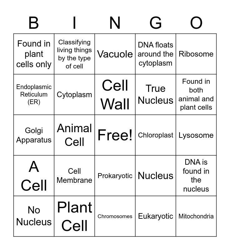 This bingo card has a free space and 24 words: Cell Membrane, Plant Cell, Cell Wall, No Nucleus, Ribosome, Found in plant cells only, Endoplasmic Reticulum (ER), Classifying living things by the type of cell, Chloroplast, Prokaryotic, True Nucleus, Golgi Apparatus, Nucleus, DNA is found in the nucleus, Cytoplasm, Eukaryotic, Lysosome, Vacuole, Found in both animal and plant cells, Animal Cell, Mitochondria, A Cell, DNA floats around the cytoplasm and Chromosomes.