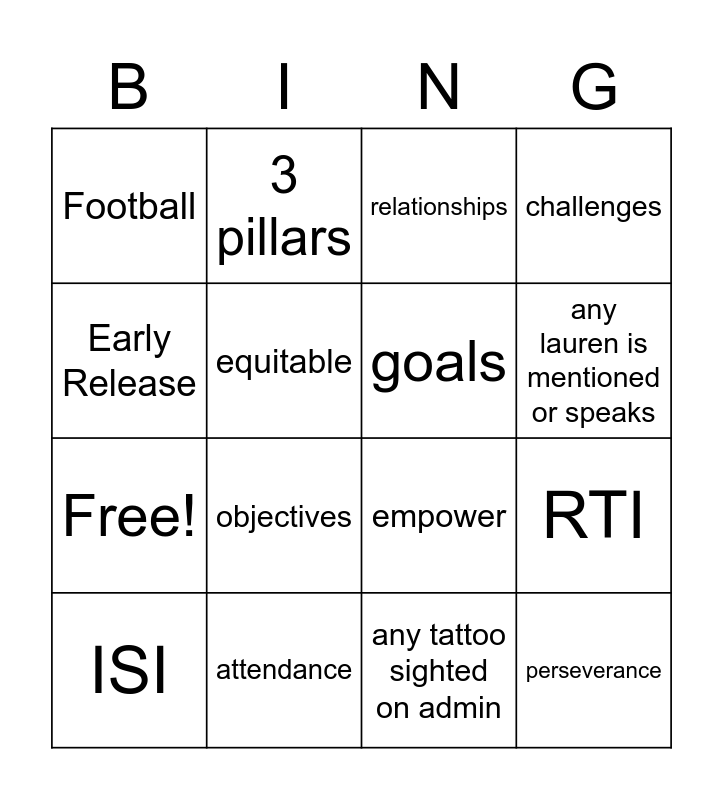 This bingo card has 20 words: RTI, disney facemask, relationships, Commons, ISI, Early Release, attendance, Football, Free!, 3 pillars, objectives, empower, equitable, perseverance, goals, Tier 1, any lauren is mentioned or speaks, challenges, any tattoo sighted on admin and learning.