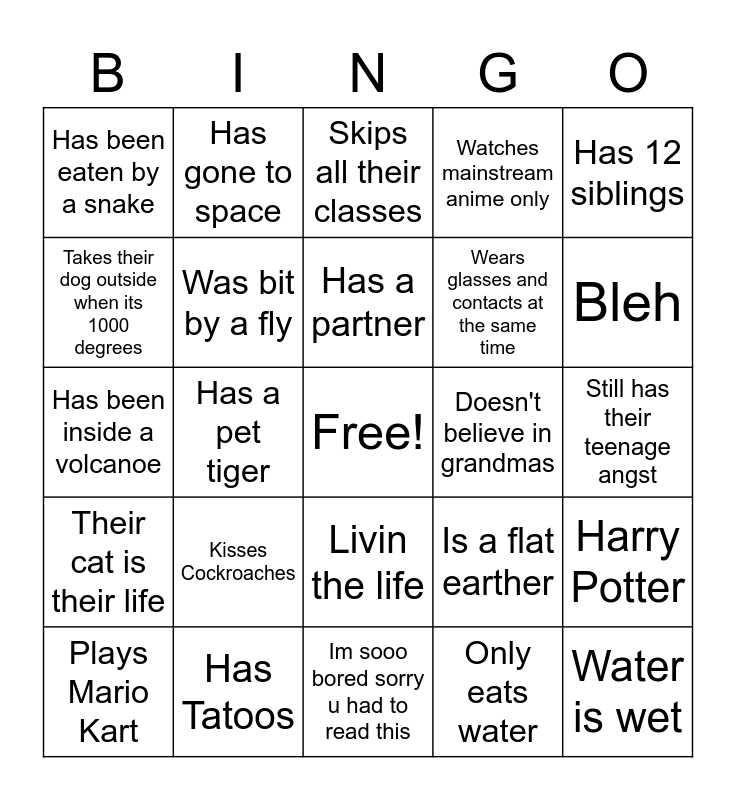 This bingo card has a free space and 24 words: Kisses Cockroaches, Has Tatoos, Has a partner, Plays Mario Kart, Has 12 siblings, Has been eaten by a snake, Takes their dog outside when its 1000 degrees, Has gone to space, Doesn't believe in grandmas, Livin the life, Wears glasses and contacts at the same time, Has been inside a volcanoe, Is a flat earther, Harry Potter, Was bit by a fly, Only eats water, Still has their teenage angst, Skips all their classes, Bleh, Has a pet tiger, Water is wet, Their cat is their life, Watches mainstream anime only and Im sooo bored sorry u had to read this.