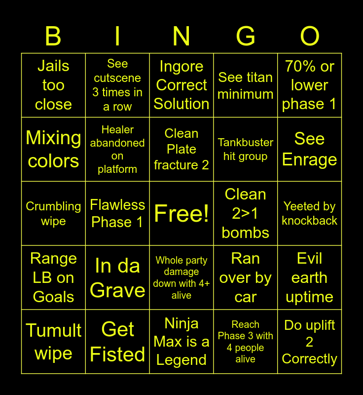 This bingo card has a free space and 24 words: In da Grave, Get Fisted, Clean Plate fracture 2, Tumult wipe, 70% or lower phase 1, Jails too close, Mixing colors, See cutscene 3 times in a row, Clean 2>1 bombs, Whole party damage down with 4+ alive, Tankbuster hit group, Crumbling wipe, Ran over by car, Evil earth uptime, Healer abandoned on platform, Reach Phase 3 with 4 people alive, Yeeted by knockback, Ingore Correct Solution, See Enrage, Flawless Phase 1, Do uplift 2 Correctly, Range LB on Goals, See titan minimum and Ninja Max is a Legend.