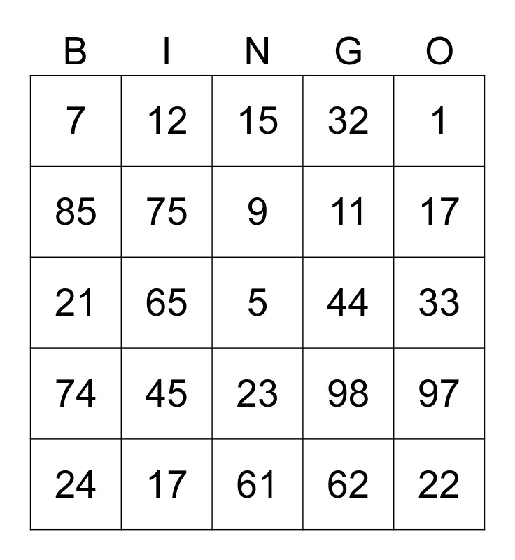 This bingo card has a free space and 24 words: 45, 17, 9, 24, 1, 7, 85, 12, 44, 23, 11, 21, 98, 97, 75, 62, 33, 15, 17, 65, 22, 74, 32 and 61.