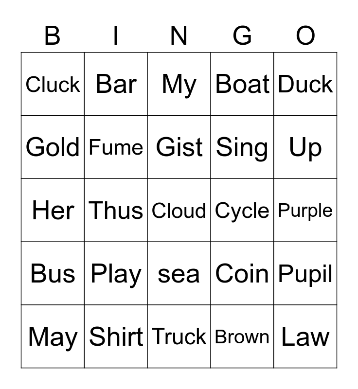 This bingo card has a free space and 24 words: Play, Shirt, Gist, May, Duck, Cluck, Gold, Bar, Cycle, sea, Sing, Her, Coin, Pupil, Fume, Brown, Purple, My, Up, Thus, Law, Bus, Boat and Truck.