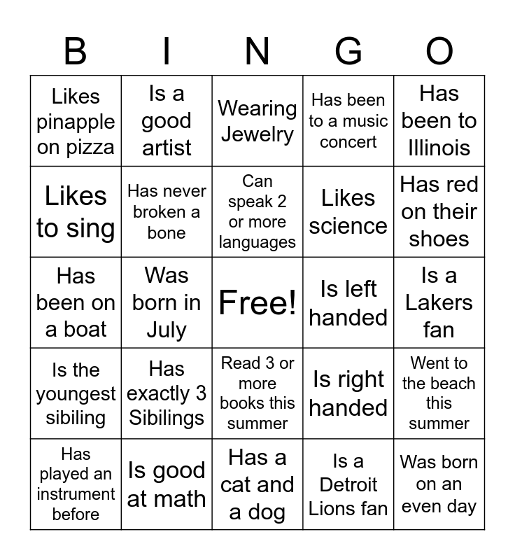 This bingo card has a free space and 24 words: Has exactly 3 Sibilings, Is good at math, Can speak 2 or more languages, Has played an instrument before, Has been to Illinois, Likes pinapple on pizza, Likes to sing, Is a good artist, Is left handed, Read 3 or more books this summer, Likes science, Has been on a boat, Is right handed, Went to the beach this summer, Has never broken a bone, Is a Detroit Lions fan, Is a Lakers fan, Wearing Jewelry, Has red on their shoes, Was born in July, Was born on an even day, Is the youngest sibiling, Has been to a music concert and Has a cat and a dog.
