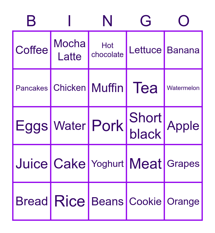 This bingo card has a free space and 24 words: Bread, Cake, Muffin, Cookie, Banana, Coffee, Mocha Latte, Hot chocolate, Short black, Apple, Eggs, Chicken, Meat, Grapes, Pancakes, Rice, Beans, Lettuce, Watermelon, Juice, Water, Yoghurt, Tea and Orange.