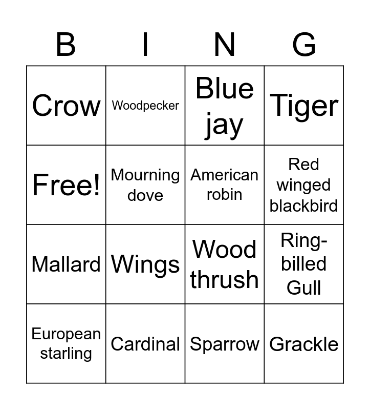 This bingo card has 16 words: Cardinal, Ring-billed Gull, Blue jay, Crow, Mallard, Woodpecker, Wood thrush, Sparrow, Free!, Mourning dove, European starling, Tiger, Wings, Red winged blackbird, American robin and Grackle.