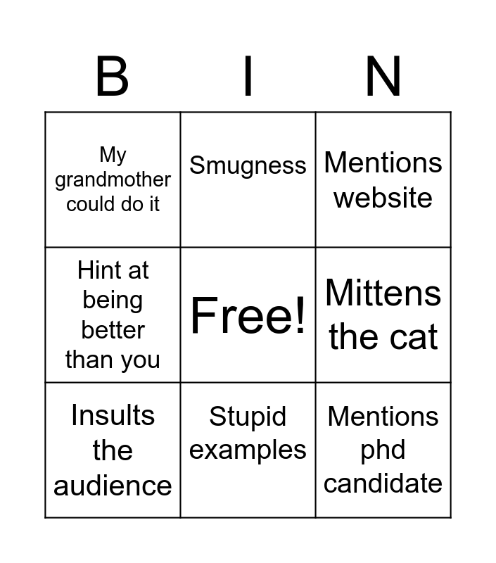 This bingo card has a free space and 8 words: Mittens the cat, Mentions website, Smugness, Insults the audience, My grandmother could do it, Mentions phd candidate, Hint at being better than you and Stupid examples.