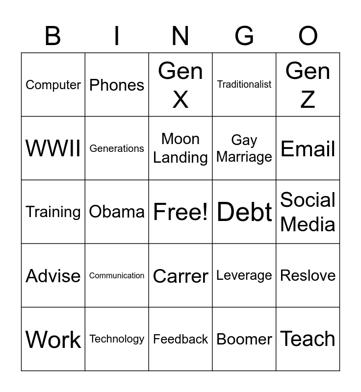 This bingo card has a free space and 43 words: Learn, Teach, Open Mind, Work, Silent, Boomer, Gen X, Millennials, Gen Z, Technology, Traditionalist, Debt, Carrer, Communication, Respect, Feedback, Knowledge, Training, Change, Email, Phones, Text, Face-to-face, Computer, TV, Social Media, Appreciate, Flex, Leverage, Advise, Acknowledge, Reslove, 9/11, Obama, Berlin Wall, JFK, Vietnam War, Moon Landing, WWII, Gay Marriage, Iraq/Afghanistan Wars, Generations and Work.