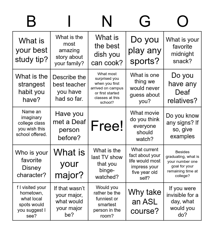 This bingo card has a free space and 24 words: What is your major?, If that wasn’t your major, what would your major be?, What most surprised you when you first arrived on campus or first started classes at this school?, f I visited your hometown, what local spots would you suggest I see?, What is your favorite midnight snack?, What is your best study tip?, What is the strangest habit you have?, What is the most amazing story about your family?, What movie do you think everyone should watch?, What is the last TV show that you binge-watched?, What is one thing we would never guess about you?, Name an imaginary college class you wish this school offered., What current fact about your life would most impress your five year old self?, Besides graduating, what is your number one goal for your remaining time at college?, Describe the best teacher you have had so far., Why take an ASL course?, Do you know any signs? If so, give examples, What is the best dish you can cook?, Do you have any Deaf relatives?, Have you met a Deaf person before?, If you were invisible for a day, what would you do?, Who is your favorite Disney character?, Do you play any sports? and Would you rather be the funniest or smartest person in the room?.
