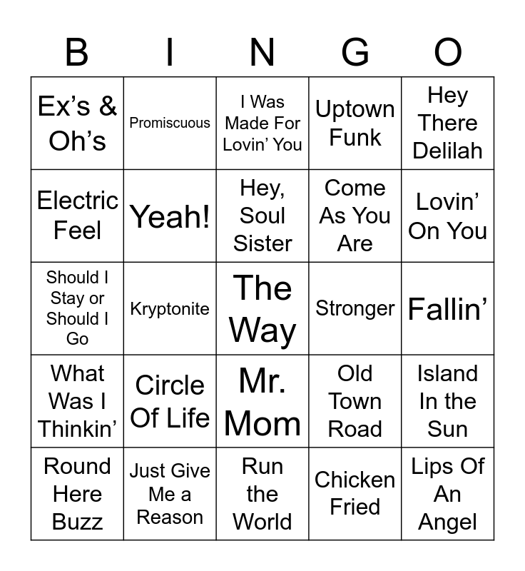 This bingo card has 49 words: That’s The Way I Like It, The Way, In My Feelings, Run the World, Circle Of Life, Perm, Promiscuous, Dance Monkey, Electric Feel, Rocket Man, Yeah!, Uptown Funk, Island In the Sun, Old Town Road, Pumped Up Kicks, A-O-K, Hey, Soul Sister, Stronger, Fancy Like, Hey There Delilah, Kryptonite, Chicken Fried, Ex’s & Oh’s, Come As You Are, Viva La Vida, Lovin’ On You, Round Here Buzz, Most People are Good, Mr. Mom, What Was I Thinkin’, Porch Swing Angel, I Want You To Want Me, Purple Haze, Go Your own Way, Just Give Me a Reason, Mississippi Queen, Give It Away, Me Too, Fallin’, Hollaback Girl, Getting’ Jiggy Wit It, Polly, Lips Of An Angel, Under The Bridge, Should I Stay or Should I Go, I Was Made For Lovin’ You, Every Rose Has Its Thorn, Here I Go Again and Billie Jean.