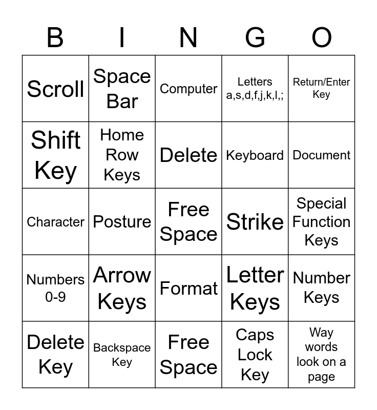 This bingo card has a free space and 24 words: Arrow Keys, Backspace Key, Delete, Delete Key, Return/Enter Key, Scroll, Shift Key, Space Bar, Strike, Format, Keyboard, Character, Letter Keys, Number Keys, Home Row Keys, Caps Lock Key, Special Function Keys, Computer, Document, Posture, Way words look on a page, Numbers 0-9, Letters a,s,d,f,j,k,l,; and Free Space.