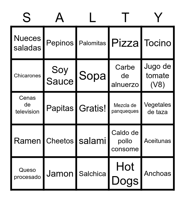 This bingo card has a free space and 24 words: Cheetos, Jamon, Sopa, Queso procesado, Tocino, Nueces saladas, Chicarones, Pepinos, Mezcla de panqueques, salami, Carbe de alnuerzo, Cenas de television, Caldo de pollo consome, Aceitunas, Soy Sauce, Hot Dogs, Vegetales de taza, Palomitas, Jugo de tomate (V8), Papitas, Anchoas, Ramen, Pizza and Salchica.