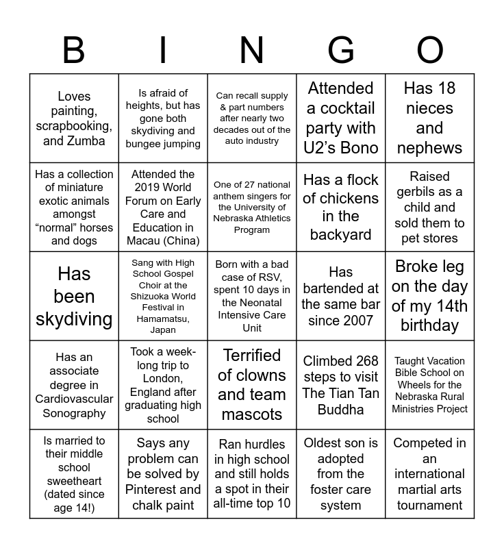 This bingo card has 42 words: Lived in Santa Cruz, California for 3 ½ years while growing up, One of 27 national anthem singers for the University of Nebraska Athletics Program, Visits their family home in Alaska regularly, Took a week-long trip to London, England after graduating high school, Oldest son is adopted from the foster care system, Taught Vacation Bible School on Wheels for the Nebraska Rural Ministries Project, Born with a bad case of RSV, spent 10 days in the Neonatal Intensive Care Unit, Started as an Art Education major first year of college, Can recall supply & part numbers after nearly two decades out of the auto industry, Terrified of clowns and team mascots, Broke leg on the day of my 14th birthday, Raised gerbils as a child and sold them to pet stores, Sang with High School Gospel Choir at the Shizuoka World Festival in Hamamatsu, Japan, Has 18 nieces and nephews, Has lived in 4 states, Climbed 268 steps to visit The Tian Tan Buddha, Has met several interesting people through their job as a movie reviewer and interviewer, Has been skydiving, Attended country school in western NE Kindergarten-8th grade, Is afraid of heights, but has gone both skydiving and bungee jumping, Has a collection of miniature exotic animals amongst “normal” horses and dogs, Has a cosmetology certificate, Competed in an international martial arts tournament, Loves painting, scrapbooking, and Zumba, Loves to try new restaurants and eat alone, Loves to fly aerobatics with the snap roll as a favorite maneuver, Has a flock of chickens in the backyard, Favorite TV show is I Love Lucy, Attended 4 different schools across Nebraska when growing up, Was born in Germany, Graduated from high school in Kabul, Afghanistan, Has an associate degree in Cardiovascular Sonography, Attended the 2019 World Forum on Early Care and Education in Macau (China), Ran hurdles in high school and still holds a spot in their all-time top 10, First person in the family to pursue and graduate from a post-secondary school, Is married to their middle school sweetheart (dated since age 14!), Says any problem can be solved by Pinterest and chalk paint, Has bartended at the same bar since 2007, Has 20 siblings (in-laws included), Married to the same person for 42 years, Attended a cocktail party with U2’s Bono and Has moved 15 times in lifetime.