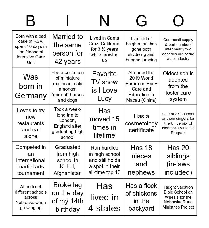 This bingo card has 42 words: Climbed 268 steps to visit The Tian Tan Buddha, Favorite TV show is I Love Lucy, Is married to their middle school sweetheart (dated since age 14!), Graduated from high school in Kabul, Afghanistan, Has a flock of chickens in the backyard, Has 20 siblings (in-laws included), Has moved 15 times in lifetime, Started as an Art Education major first year of college, Lived in Santa Cruz, California for 3 ½ years while growing up, Ran hurdles in high school and still holds a spot in their all-time top 10, One of 27 national anthem singers for the University of Nebraska Athletics Program, Oldest son is adopted from the foster care system, Took a week-long trip to London, England after graduating high school, Can recall supply & part numbers after nearly two decades out of the auto industry, Terrified of clowns and team mascots, Has 18 nieces and nephews, Has met several interesting people through their job as a movie reviewer and interviewer, Loves to try new restaurants and eat alone, Visits their family home in Alaska regularly, Married to the same person for 42 years, Was born in Germany, Says any problem can be solved by Pinterest and chalk paint, Taught Vacation Bible School on Wheels for the Nebraska Rural Ministries Project, Born with a bad case of RSV, spent 10 days in the Neonatal Intensive Care Unit, Attended a cocktail party with U2’s Bono, Has bartended at the same bar since 2007, Attended the 2019 World Forum on Early Care and Education in Macau (China), Raised gerbils as a child and sold them to pet stores, Loves painting, scrapbooking, and Zumba, Loves to fly aerobatics with the snap roll as a favorite maneuver, First person in the family to pursue and graduate from a post-secondary school, Competed in an international martial arts tournament, Has a collection of miniature exotic animals amongst “normal” horses and dogs, Has lived in 4 states, Attended country school in western NE Kindergarten-8th grade, Attended 4 different schools across Nebraska when growing up, Broke leg on the day of my 14th birthday, Has a cosmetology certificate, Sang with High School Gospel Choir at the Shizuoka World Festival in Hamamatsu, Japan, Has an associate degree in Cardiovascular Sonography, Is afraid of heights, but has gone both skydiving and bungee jumping and Has been skydiving.