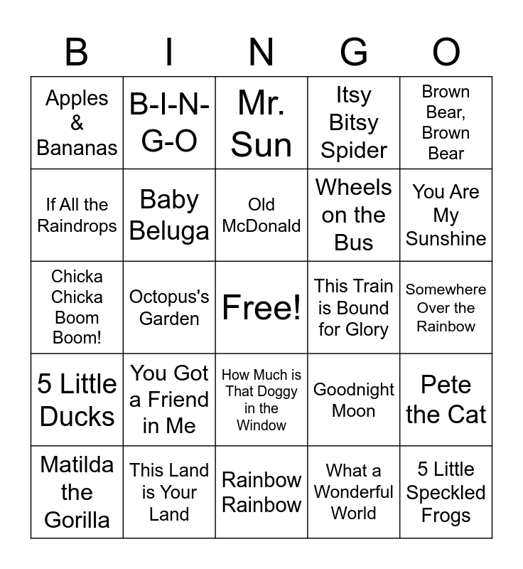 This bingo card has a free space and 24 words: You Got a Friend in Me, This Land is Your Land, Old McDonald, Matilda the Gorilla, Brown Bear, Brown Bear, Apples & Bananas, If All the Raindrops, B-I-N-G-O, This Train is Bound for Glory, How Much is That Doggy in the Window, Wheels on the Bus, Chicka Chicka Boom Boom!, Goodnight Moon, Pete the Cat, Baby Beluga, What a Wonderful World, Somewhere Over the Rainbow, Mr. Sun, You Are My Sunshine, Octopus's Garden, 5 Little Speckled Frogs, 5 Little Ducks, Itsy Bitsy Spider and Rainbow Rainbow.