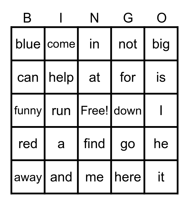 This bingo card has a free space and 24 words: a, and, at, away, big, blue, can, come, down, find, for, funny, go, he, help, here, I, in, is, run, it, red, not and me.