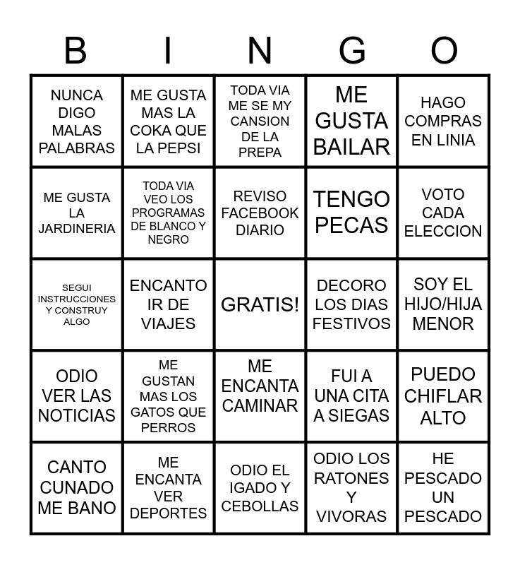 This bingo card has a free space and 24 words: ME GUSTAN MAS LOS GATOS QUE PERROS, ME ENCANTA VER DEPORTES, REVISO FACEBOOK DIARIO, CANTO CUNADO ME BANO, HAGO COMPRAS EN LINIA, NUNCA DIGO MALAS PALABRAS, ME GUSTA LA JARDINERIA, ME GUSTA MAS LA COKA QUE LA PEPSI, DECORO LOS DIAS FESTIVOS, ME ENCANTA CAMINAR, TENGO PECAS, SEGUI INSTRUCCIONES Y CONSTRUY ALGO, FUI A UNA CITA A SIEGAS, PUEDO CHIFLAR ALTO, TODA VIA VEO LOS PROGRAMAS DE BLANCO Y NEGRO, ODIO LOS RATONES Y VIVORAS, SOY EL HIJO/HIJA MENOR, TODA VIA ME SE MY CANSION DE LA PREPA, VOTO CADA ELECCION, ENCANTO IR DE VIAJES, HE PESCADO UN PESCADO, ODIO VER LAS NOTICIAS, ME GUSTA BAILAR and ODIO EL IGADO Y CEBOLLAS.