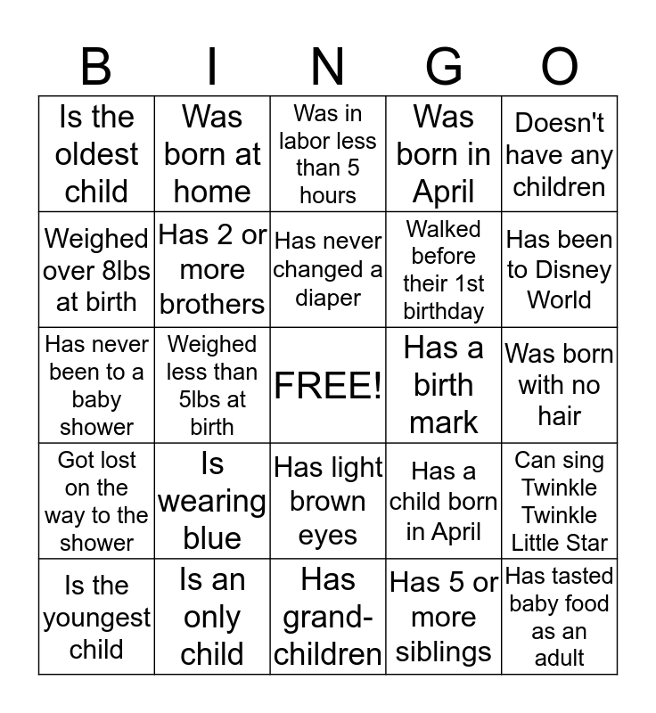 This bingo card has a free space and 24 words: Is wearing blue, Is an only child, Has never changed a diaper, Is the youngest child, Doesn't have any children, Is the oldest child, Weighed over 8lbs at birth, Was born at home, Has a birth mark, Has light brown eyes, Walked before their 1st birthday, Has never been to a baby shower, Has a child born in April, Can sing Twinkle Twinkle Little Star, Has 2 or more brothers, Has 5 or more siblings, Was born with no hair, Was in labor less than 5 hours, Has been to Disney World, Weighed less than 5lbs at birth, Has tasted baby food as an adult, Got lost on the way to the shower, Was born in April and Has grand-children.