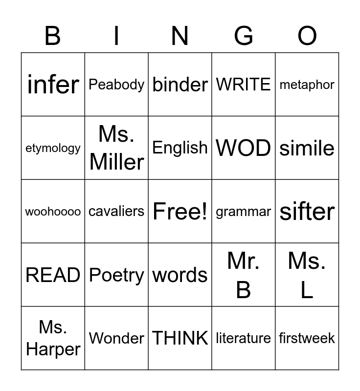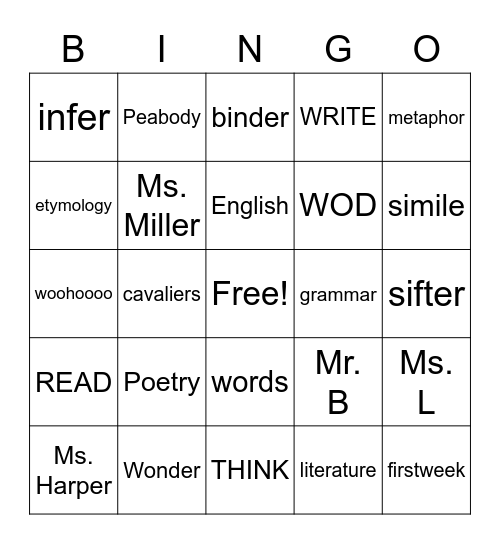 This bingo card has a free space and 24 words: Poetry, Wonder, English, Ms. Harper, metaphor, infer, etymology, Peabody, grammar, words, WOD, woohoooo, Mr. B, Ms. L, Ms. Miller, literature, sifter, binder, simile, cavaliers, firstweek, READ, WRITE and THINK.