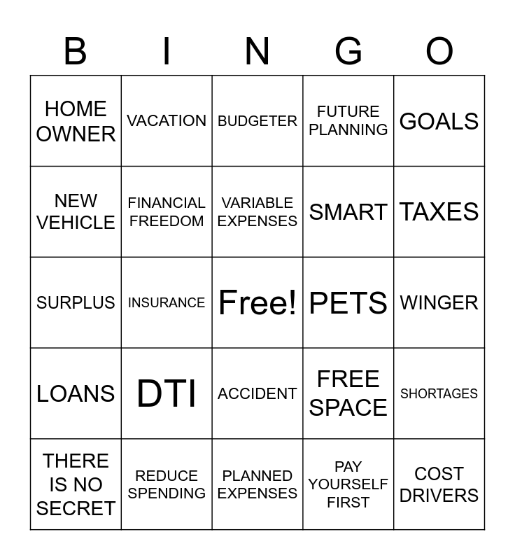This bingo card has a free space and 25 words: DTI, PLANNED EXPENSES, VARIABLE EXPENSES, THERE IS NO SECRET, GOALS, HOME OWNER, NEW VEHICLE, VACATION, PETS, ACCIDENT, SMART, SURPLUS, FREE SPACE, SHORTAGES, FINANCIAL FREEDOM, TIMELINE, WINGER, BUDGETER, TAXES, INSURANCE, COST DRIVERS, REDUCE SPENDING, LOANS, FUTURE PLANNING and PAY YOURSELF FIRST.