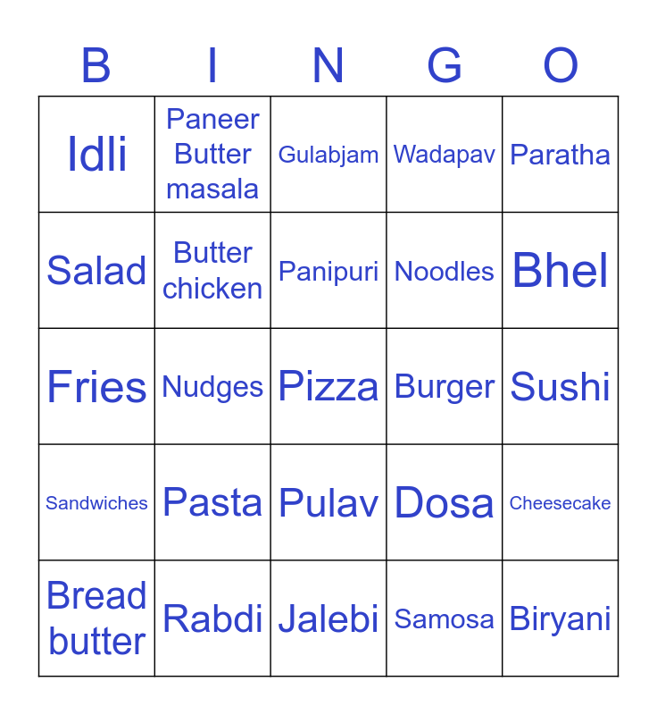 This bingo card has a free space and 24 words: Pasta, Rabdi, Panipuri, Bread butter, Paratha, Idli, Salad, Paneer Butter masala, Burger, Pulav, Noodles, Fries, Dosa, Cheesecake, Butter chicken, Samosa, Sushi, Gulabjam, Bhel, Nudges, Biryani, Sandwiches, Wadapav and Jalebi.