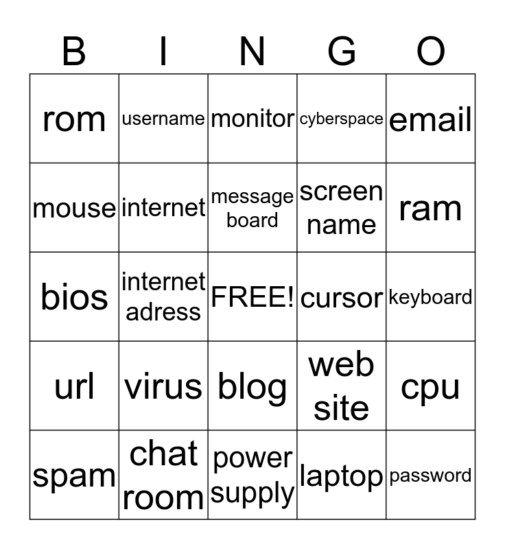 This bingo card has a free space and 24 words: virus, chat room, message board, spam, email, rom, mouse, username, cursor, blog, screen name, bios, web site, cpu, internet, laptop, keyboard, monitor, ram, internet adress, password, url, cyberspace and power supply.