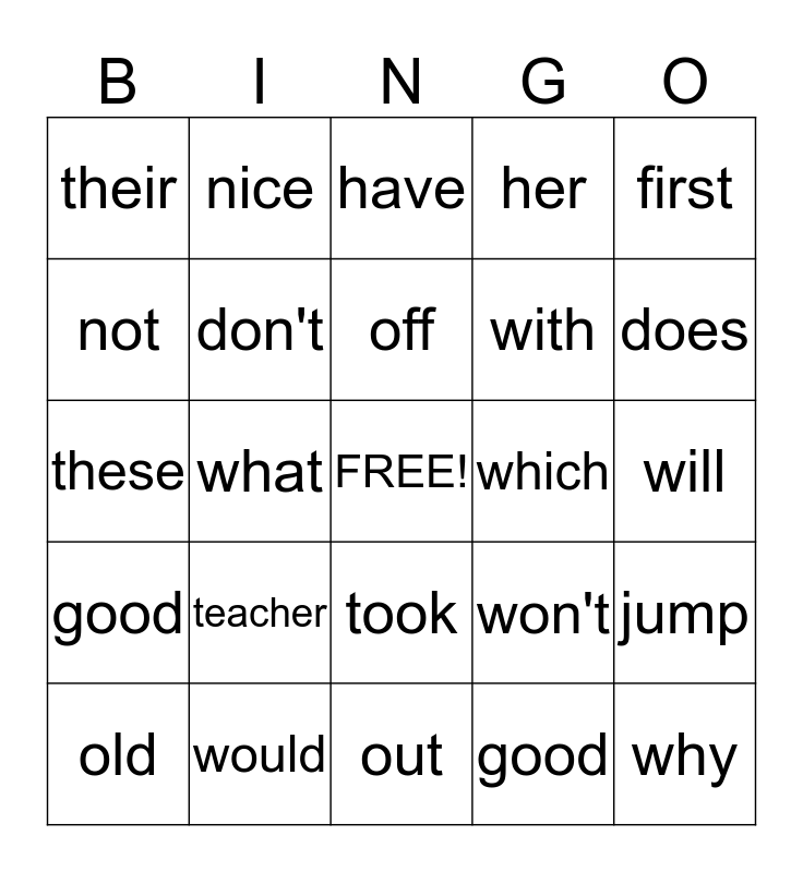 This bingo card has a free space and 25 words: teacher, out, off, old, first, their, not, nice, which, took, with, these, won't, jump, don't, school, will, have, does, what, why, would, good, her and good.
