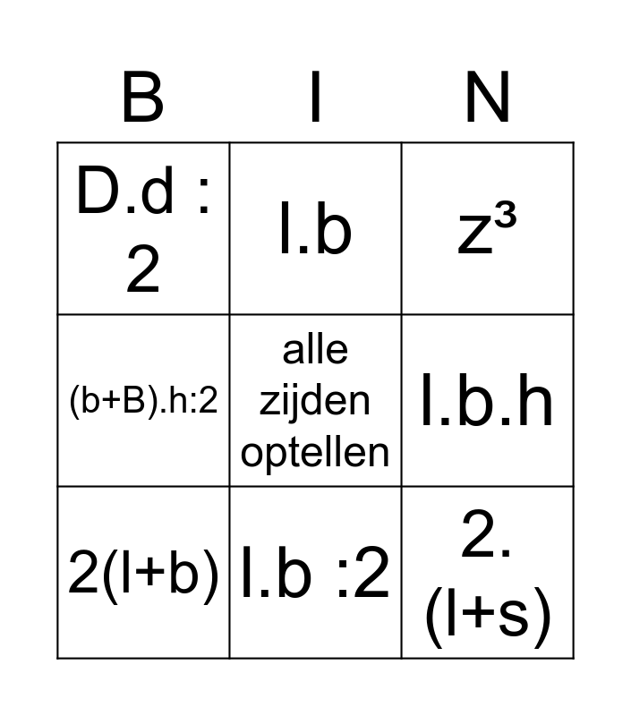 This bingo card has a free space and 13 words: 4z, z², 2(l+b), l.b, (b+B).h:2, 2.(l+s), 2.r.pi, r².pi, l.b :2, D.d : 2, l.b.h, z³ and 2.l.b + 2.l.h + 2.b.h.