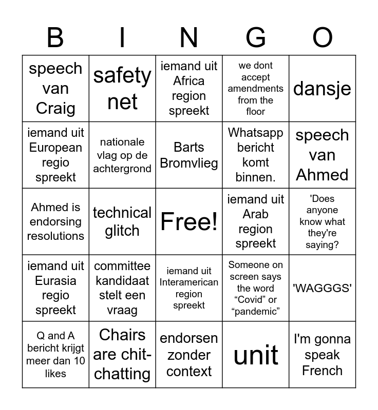 This bingo card has a free space and 37 words: biggest virtual conference yet, aantal deelnemers noemen, now the delegates of X will... not speak, nationale vlag op de achtergrond, 'WAGGGS', committee kandidaat stelt een vraag, Barts Bromvlieg, poes loopt binnen, dansje, belletje, technical glitch, we dont accept amendments from the floor, I'm gonna speak French, 'Does anyone know what they're saying?, iemand uit European regio spreekt, iemand uit Eurasia regio spreekt, iemand uit APR regio spreekt, iemand uit Africa region spreekt, iemand uit Interamerican region spreekt, iemand uit Arab region spreekt, speech van Craig, speech van Ahmed, Q and A bericht krijgt meer dan 10 likes, endorsen zonder context, potato potaato/tomaato, unit, safety net, flipping the narrative, YA candidate stelt een vraag, Committee candidate spreekt, You have to accept the invitation, Chairs are chit-chatting, Ahmed is endorsing resolutions, Someone on screen says the word “Dubai”, Someone on screen says the word “Covid” or “pandemic”, Whatsapp bericht komt binnen. and Chairs asking for money to re-energise the Scouting fund..