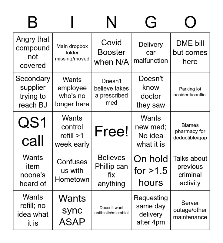 This bingo card has a free space and 30 words: Wants sync ASAP, Lost control drug (store/patient), Wants control refill >1 week early, Has insurance but no card, Angry that compound not covered, Covid Booster when N/A, Wants employee who's no longer here, Believes Phillip can fix anything, Wants new med; No idea what it is, Doesn't want antibiotic/microbial, Blames pharmacy for deductible/gap, Server outage/other maintenance, Requesting same day delivery after 4pm, Here for covid testing, Parking lot accident/conflict, Has copays but believes shouldn't, On hold for >1.5 hours, Wants item noone's heard of, Confuses us with Hometown, DME bill but comes here, QS1 call, DME request on saturday/by drive through, Main dropbox folder missing/moved, Doesn't know doctor they saw, Secondary supplier trying to reach BJ, Delivery car malfunction, Talks about previous criminal activity, Wants refill; no idea what it is, Doesn't believe takes a prescribed med and comes in with covid.