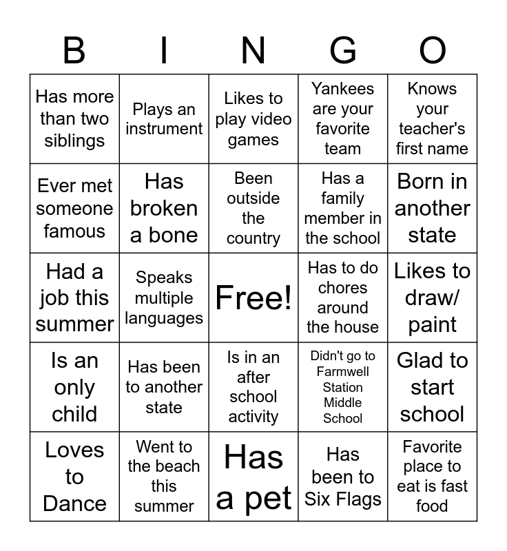 This bingo card has a free space and 29 words: Loves to Dance, Likes to read, Speaks multiple languages, Plays a sport, Has more than two siblings, Likes to play video games, Has broken a bone, Has been to another state, Has to do chores around the house, Went to the beach this summer, Likes to draw/ paint, Favorite place to eat is fast food, Has a pet, Has been to Six Flags, Born in another state, Has traveled internationally, Is in an after school activity, Is an only child, Knows your teacher's first name, Had a job this summer, Didn't go to Farmwell Station Middle School, Has blue eyes, Has a family member in the school, Ever met someone famous, Yankees are your favorite team, Plays an instrument, Glad to start school, Been outside the country and Like to play sports.
