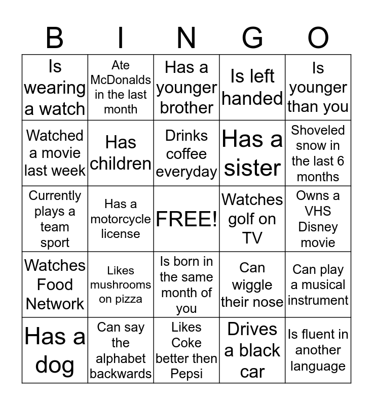 This bingo card has a free space and 24 words: Likes mushrooms on pizza, Can say the alphabet backwards, Drinks coffee everyday, Has a dog, Is younger than you, Is wearing a watch, Watched a movie last week, Ate McDonalds in the last month, Watches golf on TV, Is born in the same month of you, Has a sister, Currently plays a team sport, Can wiggle their nose, Can play a musical instrument, Has children, Drives a black car, Owns a VHS Disney movie, Has a younger brother, Shoveled snow in the last 6 months, Has a motorcycle license, Is fluent in another language, Watches Food Network, Is left handed and Likes Coke better then Pepsi.