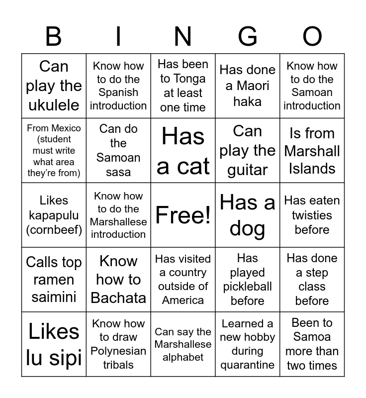 This bingo card has a free space and 50 words: Know how to do the Tongan introduction, Been to Samoa more than two times, Can say the whole Mana creed, Can say the Marshallese alphabet, Know how to Bachata, Know how to pat your head and rub your stomach, Know how to do the Spanish introduction, From a Latin American country that IS NOT Mexico, From Mexico (student must write what area they’re from), Can do a Tongan taualuga, Can do the Samoan sasa, Has done a Maori haka, Has done a step class before, Has played pickleball before, Can do a Marshallese dance, Plays a sport, Has a cat, Has a dog, Has a lizard, Know how to do the Samoan introduction, Know how to do the Marshallese introduction, Learned a new hobby during quarantine, Can play the ukulele, Can play the guitar, Can play the piano, Likes anime, Is from Marshall Islands, Is from Mexico, Has been to Tonga at least one time, Has visited a country outside of America, Has been to Hawaii, Was named after someone in their family, Knows how to serve kava, Is part of a Polynesian dance group, Know how to draw Polynesian tribals, Knows how to draw anime characters, Has used a chancla as a weapon, Can do a TikTok dance, Has done de la rosa challenge, Has eaten twisties before, Has cooked food before, Is the oldest in their family, Is the youngest in their family, Has more than 5 siblings, Likes lu sipi, Likes kapapulu (cornbeef), Has put kool aid in their saimini, Likes eat taki’s, Calls top ramen saimini and Has put kool aid with gummy bears.