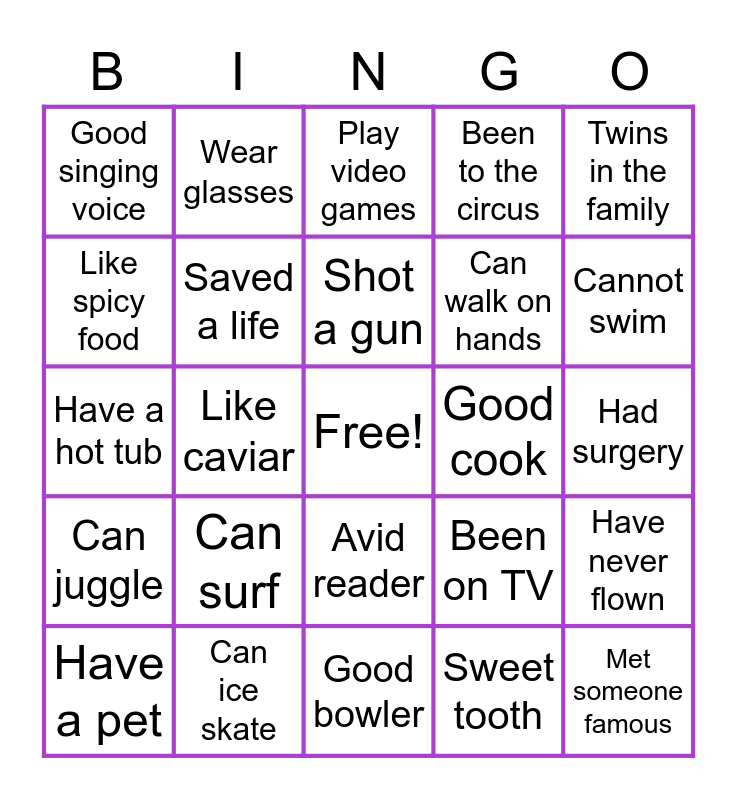 This bingo card has a free space and 44 words: Play tennis, Met someone famous, Know a magic trick, Have a pet, Have 0 cavities, Sweet tooth, Play video games, Bite my nails, Twins in the family, Can ice skate, Been to the circus, Good cook, Avid reader, Can surf, Play an instrument, Good bowler, Scared of spiders, Have a hot tub, Have scuba dived, Cannot swim, Wear glasses, Never left the USA, Can drive a stick, Good singing voice, Have nice handwriting, Had surgery, Am an only child, Been skydiving, Been on TV, Can juggle, Been on a cruise, Have never flown, Can surf, Have a garden, Like caviar, Had a broken bone, Waited tables, Swam w/ dolphins, Shot a gun, Like spicy food, Can walk on hands, Bid at auction, Saved a life and Donated blood.
