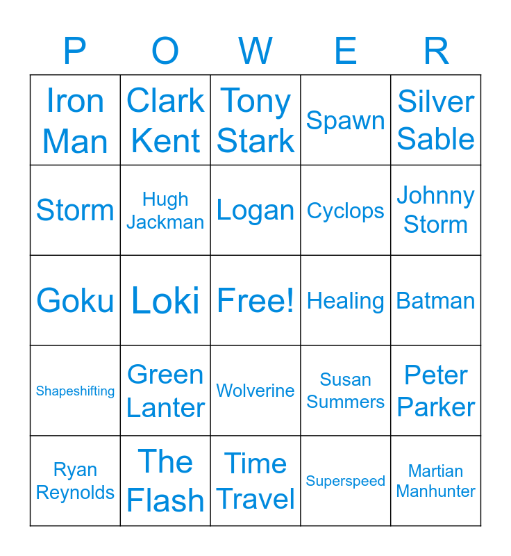 This bingo card has a free space and 69 words: Superman, Batman, Teleportation, Invisibility, The Flash, Punisher, Spawn, The Joker, Silver Sable, Spiderman, Peter Parker, Jonah J. Jameson, Iron Man, Tony Stark, Pepper Potts, Loki, Wolverine, Cyclops, Flight, Shapeshifting, Healing, Susan Summers, Johnny Storm, Barry Allen, Buck Rogers, Twiggy, The Phantom, Miss Martian, Superspeed, Super Strength, Clark Kent, Lois Lane, The Daily Planet, Mira, Telekinesis, Elemental Control, Mind Control, Dr. Death, Storm, Dark Angel, Green Lanter, Martian Manhunter, Supergirl, Deadshot, Deadpool, Ryan Reynolds, Jason Momoa, Mark K. Hill, Ben Affleck, Hugh Jackman, Logan, X-Ray Vision, Intangibility, Time Travel, Sailor Moon, Tuxedo Mask, Sailor Scouts, Regeneration, Power Rangers, Goku, Deku, Cell, Vageta, Naruto, Hinata, Inuyasha, Miles Morales, Michael Jordan and Monkey D. Luffy.