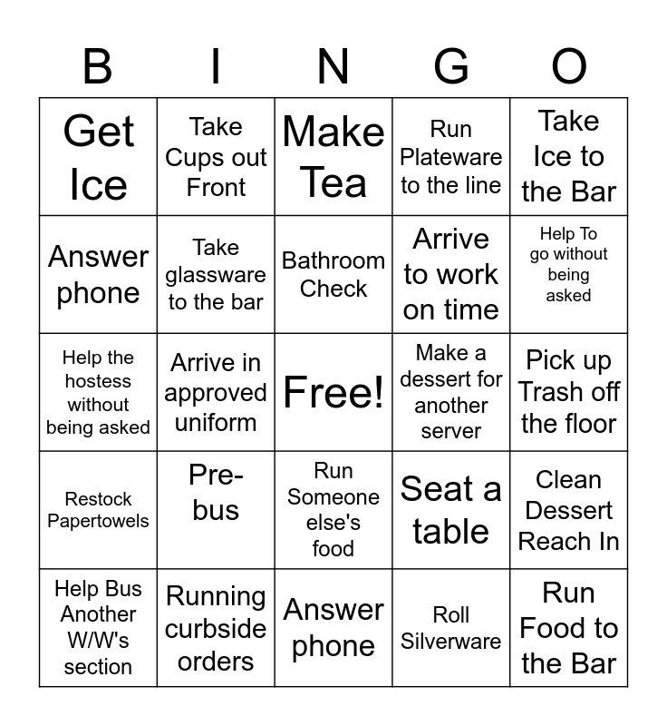 This bingo card has a free space and 24 words: Pre-bus, Running curbside orders, Bathroom Check, Help Bus Another W/W's section, Take Ice to the Bar, Get Ice, Answer phone, Take Cups out Front, Make a dessert for another server, Run Someone else's food, Arrive to work on time, Help the hostess without being asked, Seat a table, Clean Dessert Reach In, Take glassware to the bar, Roll Silverware, Pick up Trash off the floor, Make Tea, Help To go without being asked, Arrive in approved uniform, Run Food to the Bar, Restock Papertowels, Run Plateware to the line and Answer phone.