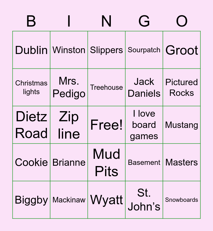 This bingo card has a free space and 25 words: Brianne, Wyatt, Treehouse, Biggby, Groot, Dublin, Christmas lights, Winston, I love board games, Mud Pits, Jack Daniels, Dietz Road, Basement, Masters, Mrs. Pedigo, Burkley Road, Mustang, Slippers, Pictured Rocks, Zip line, Snowboards, Mackinaw, Cookie, Sourpatch and St. John’s.